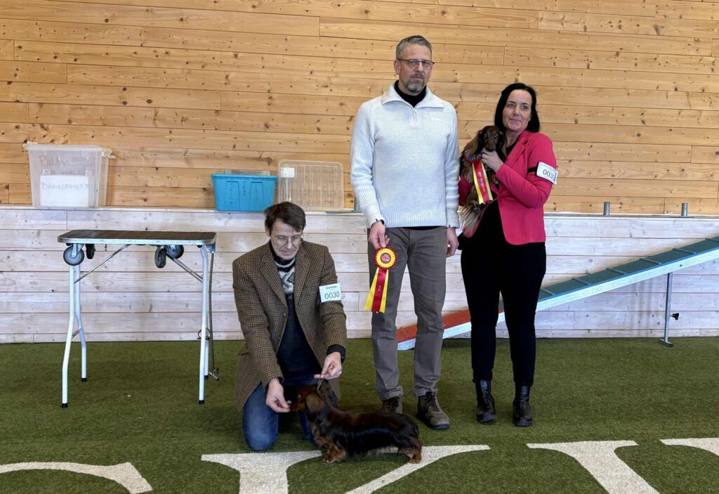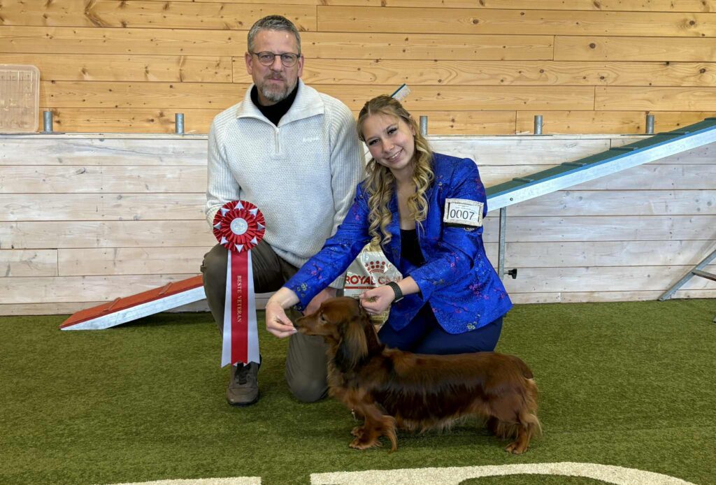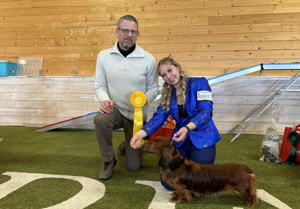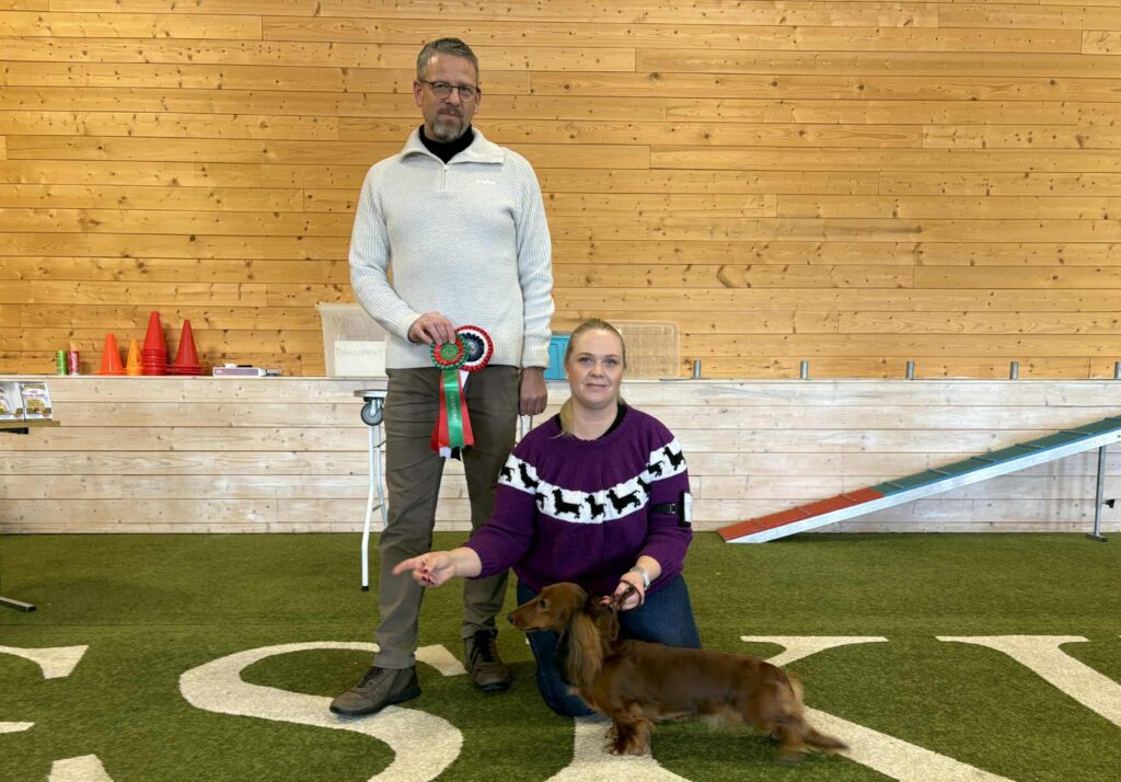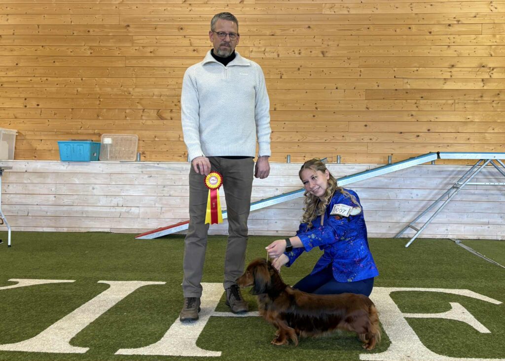 Anita og Åge Solberg var også eiere av dagens peneste valp, Minstemann’s Esme (dvergdachshund korthåret). BIS 2 valp ble Chirabida’s Osborn, eier er Trude Sandberg.